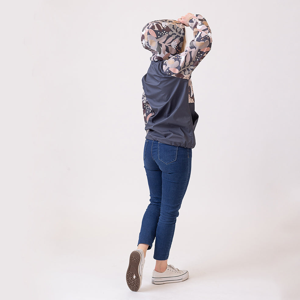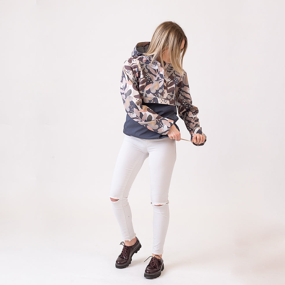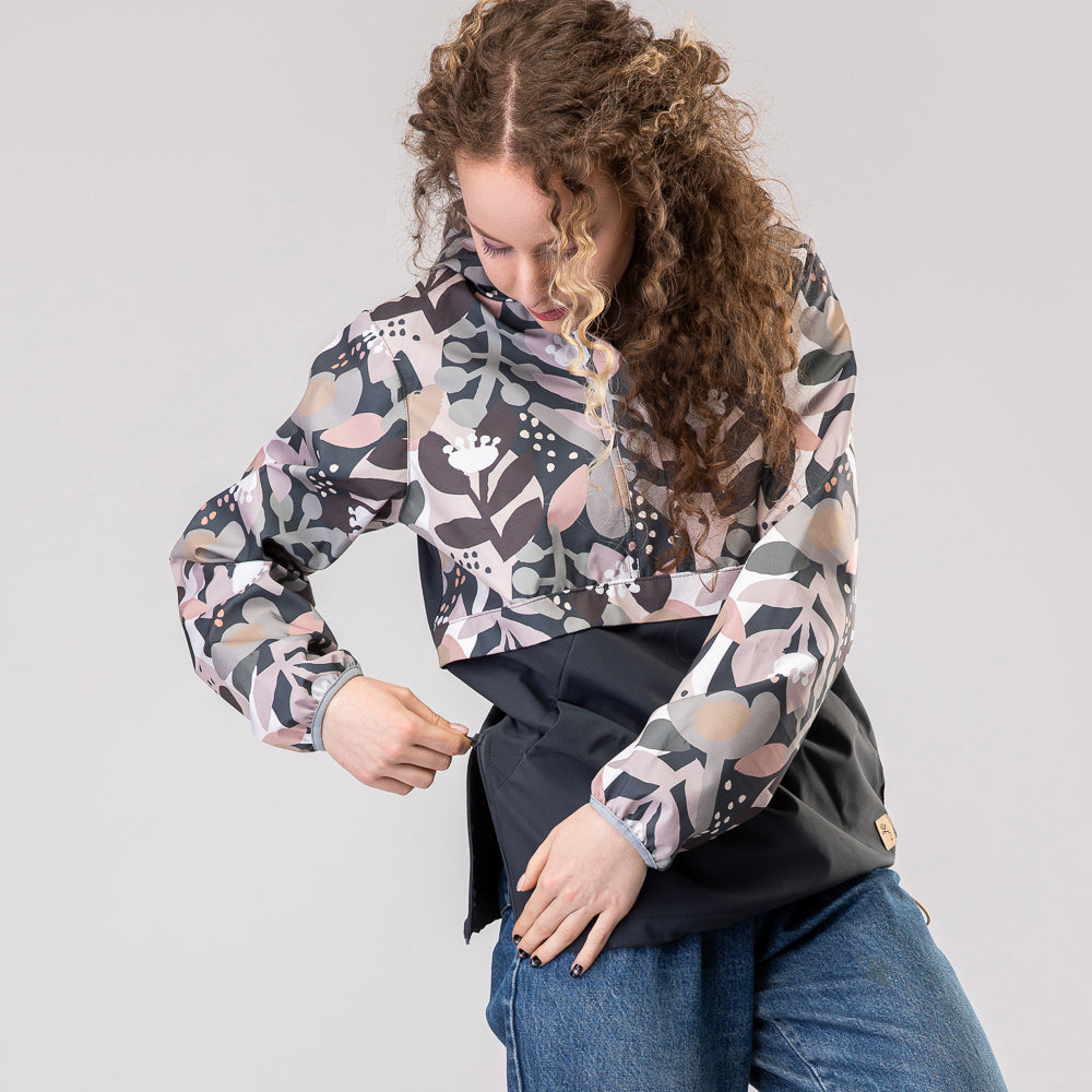 The short neck zipper and spacious pockets give it a sporty character, accentuated by the drawstring hood.
