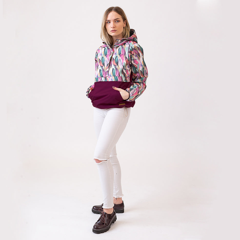 The short neck zipper and spacious pockets give it a sporty character, accentuated by the drawstring hood.