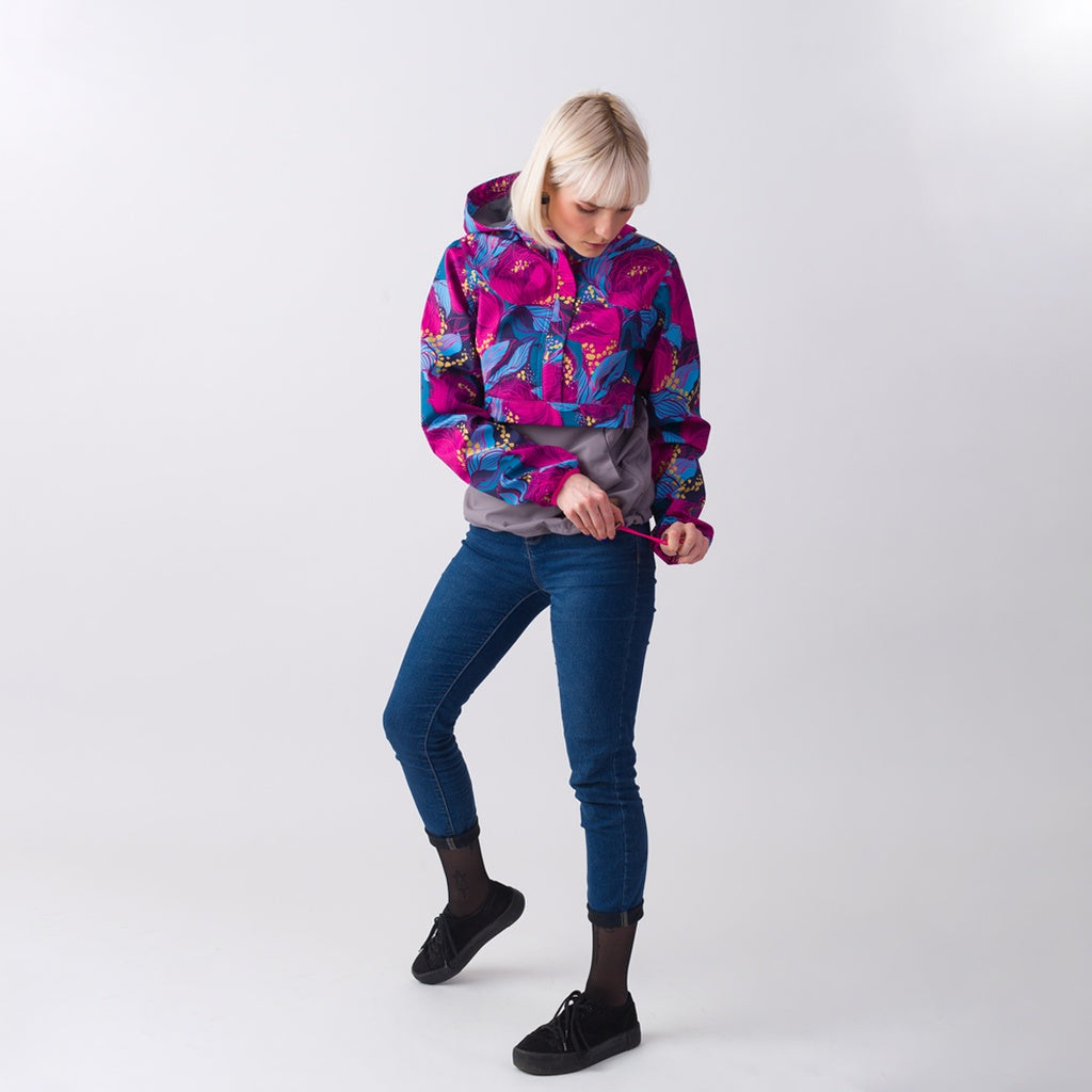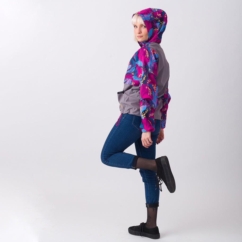 The short neck zipper and spacious pockets give it a sporty character, accentuated by the drawstring hood.