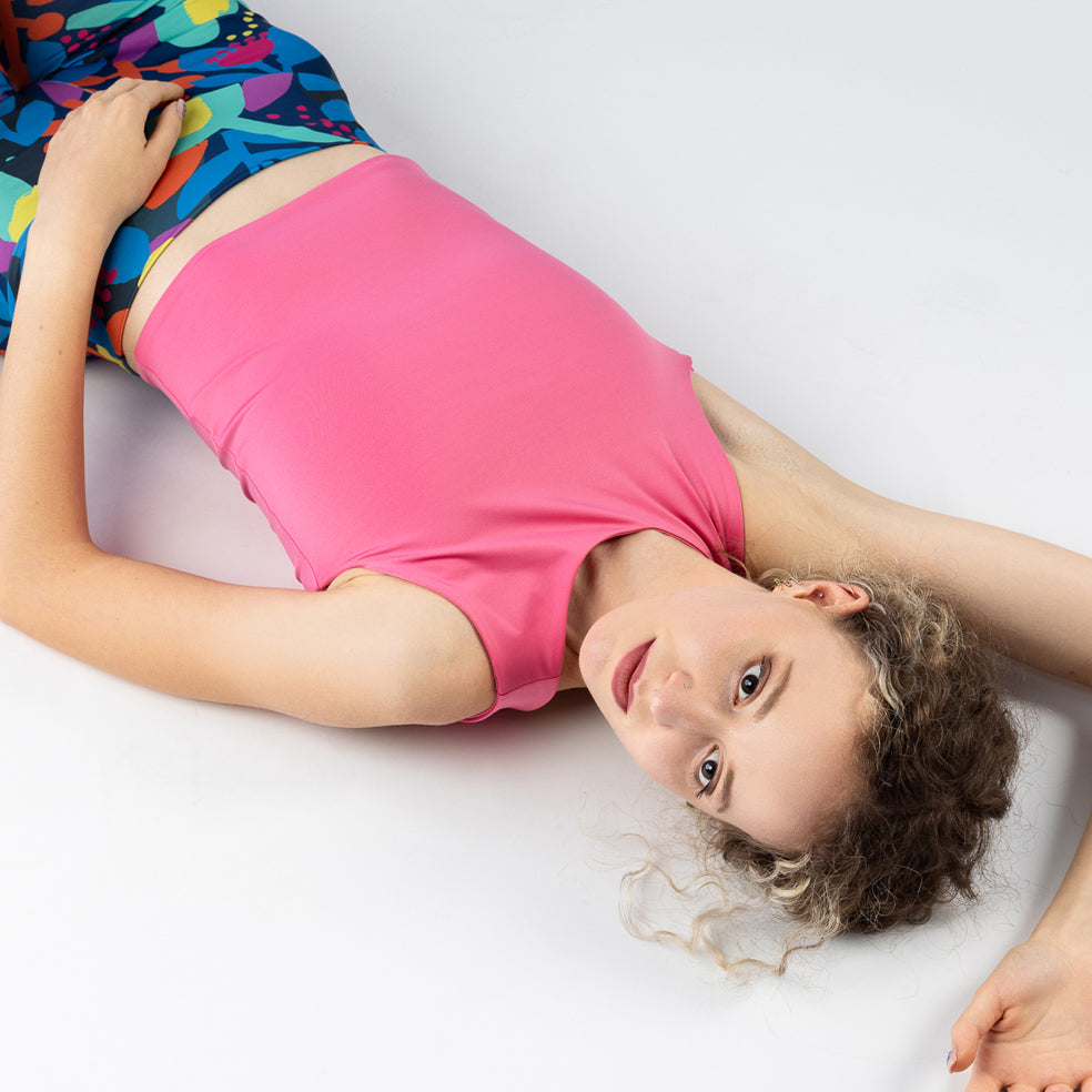 Ez a dupla rétegű sportfelső rugalmas, gyorsan száradó anyagból készült, így kényelmes viselet intenzív mozgás közben is. A hátul dekoltált, elöl zártabb kialakítás optimális mozgásszabadságot és stabilitást biztosít. Jó választás jógához, pilateshez vagy futáshoz.